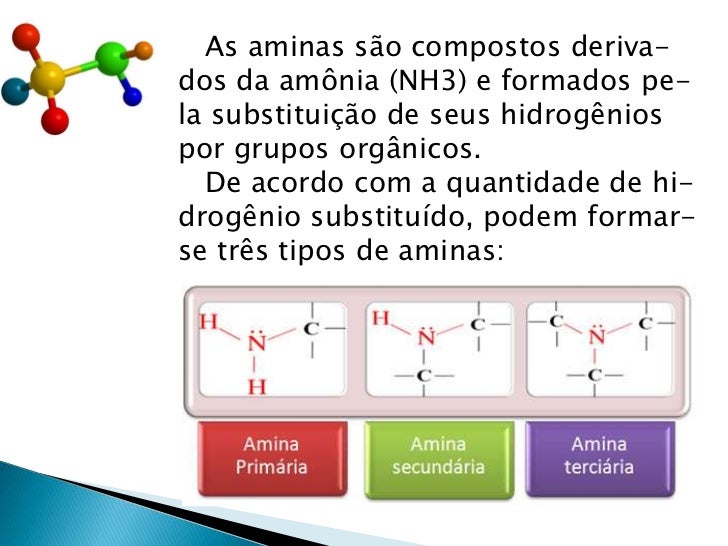O que é amina. É uma classe química de compostos orgânicos nitrogenados, ou seja, aqueles constituídos de uma cadeia carbônica e com a presença de átomos de nitrogênio, derivados da amônia (NH 3).Podem ser classificados conforme a quantidade de hidrogênios no NH 3 que foram substituídos, sendo primária, secundária ou terciária se um, dois ou três hidrogênios forem trocados.