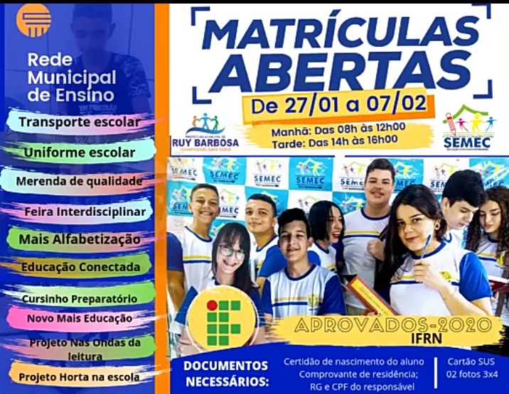 RUY BARBOSA EM AÇÃO! Matrículas das Escolas da Rede Municipal de Ensino de Ruy Barbosa/RN 2020.