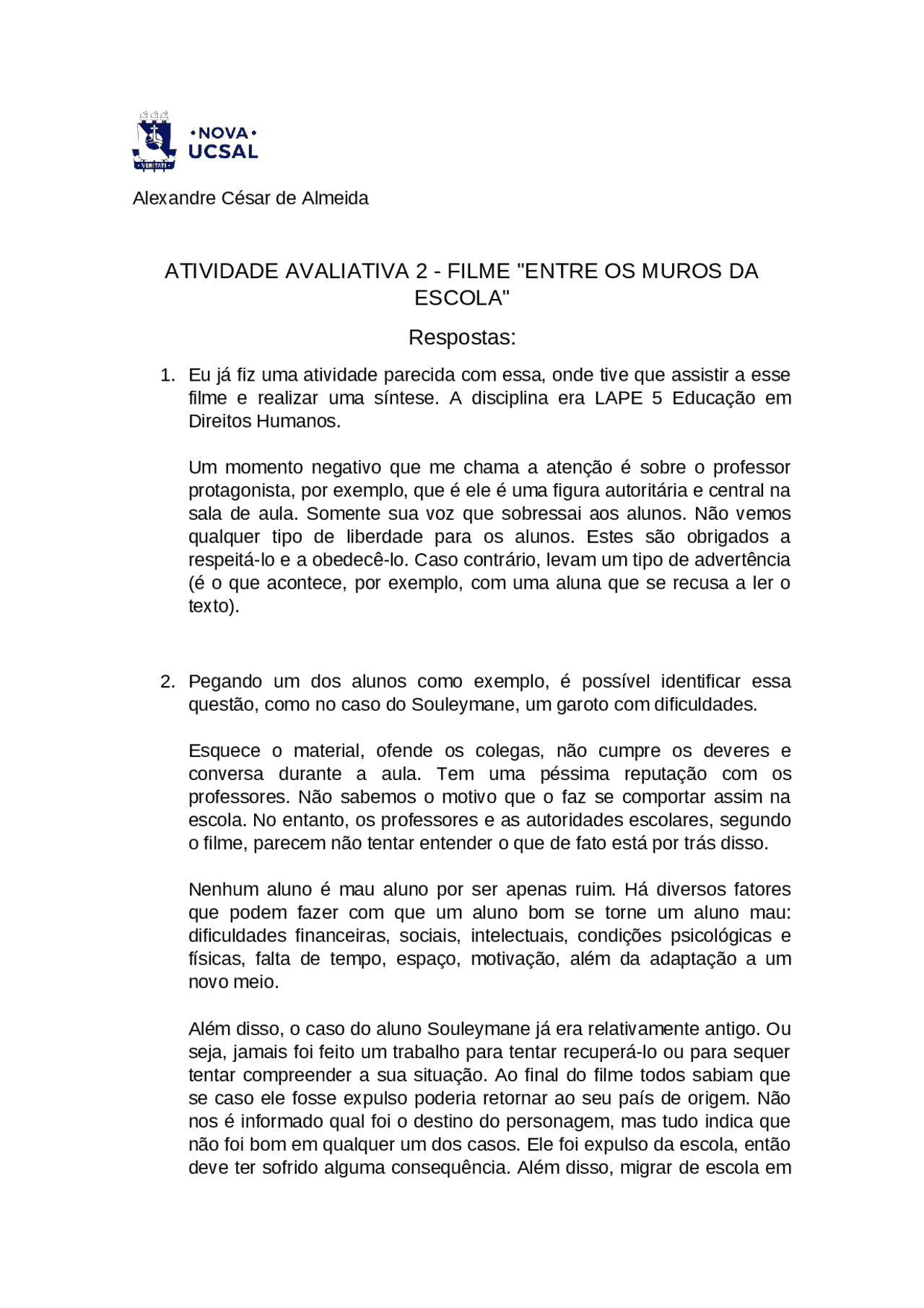 Enviada em 7 de novembro de 2018. O filme "Entre os muros da escola", retrata os desafios do professor em sala de aula. O ponto forte da obra se encontra no embate entre as variedades étnicas.