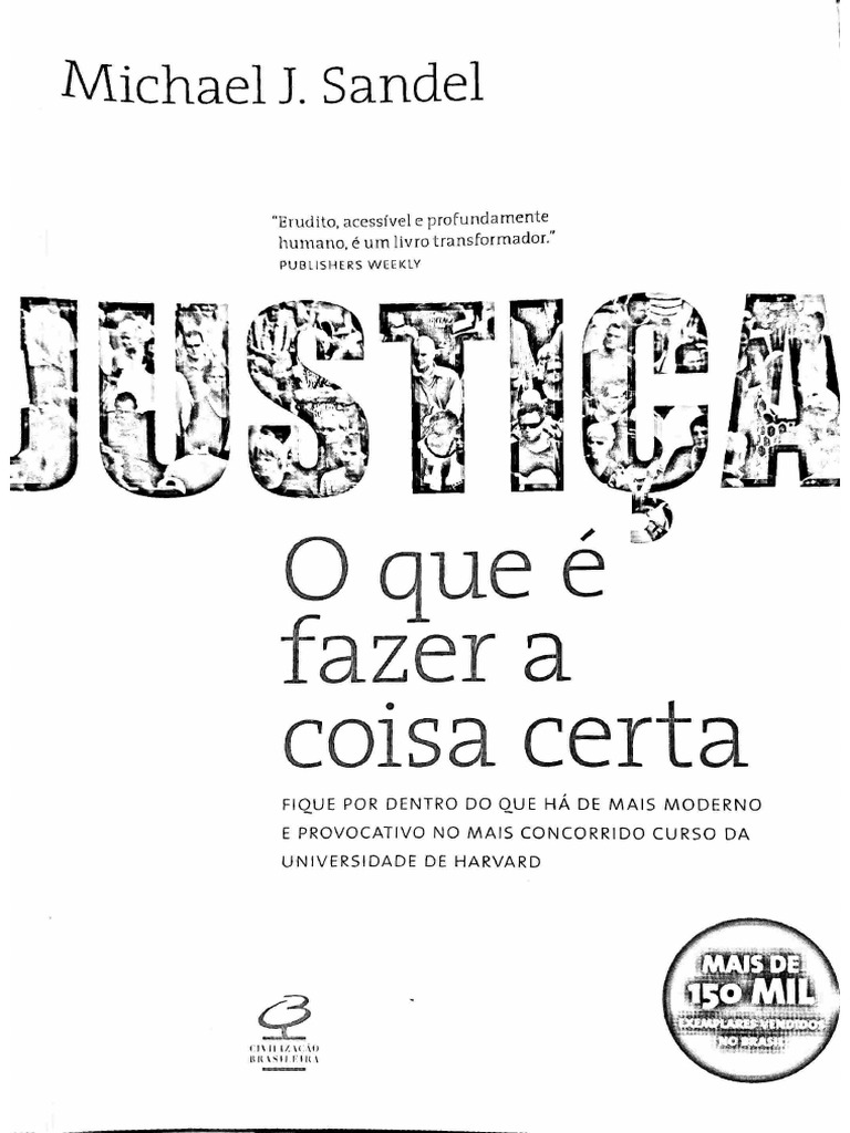 SANDEL, Michael. Justiça: o que é fazer a coisa certa. Rio de Janeiro: Civilização Brasileira, 2011.Resenha de: BOMBASSARO, Alessandra. Conjectura, Caxias do Sul, v. 17, n. 2, p. 183-186, maio/ago, 2012. Considerando um dos mais importantes filósofos de sua geração, Michael Sandel leciona há mais de vinte anos na Universidade de Harvard.