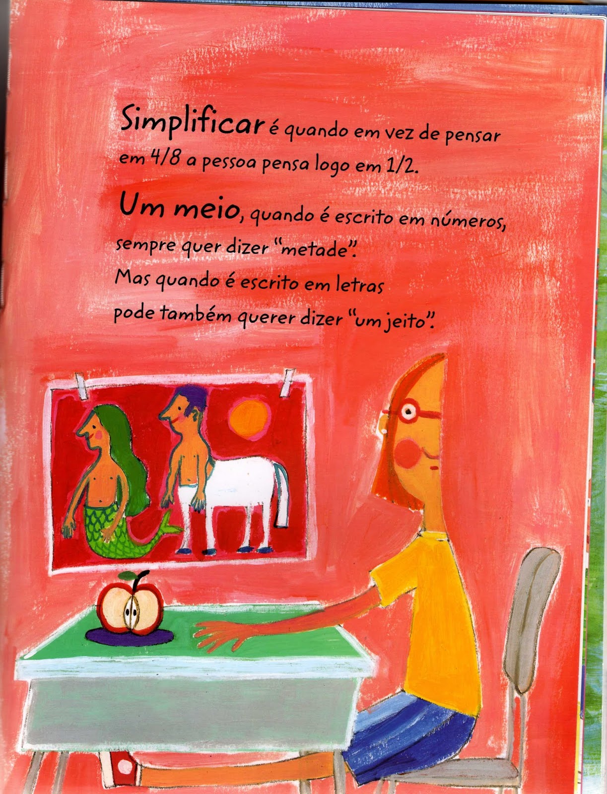 de questionamentos e de reflexões a partir de conceitos como: Livro: Mania de Explicação, de Adriana Falcão "Simplificaré quando em vez de pensar em 4/8 a pessoa pensa logo em ½." "Ummeio, quando é escrito em números, sempre quer dizer 'metade'. Mas quando é escrito em letras pode também quererdizer 'umjeito'."