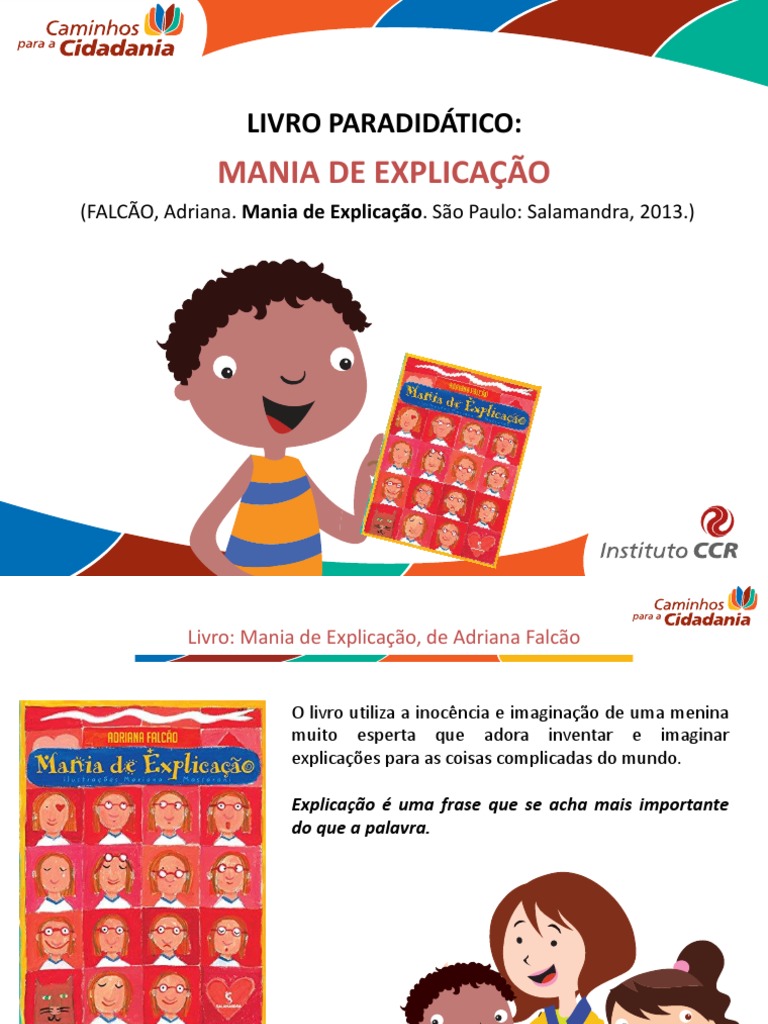 Livro de Práticas; Obras Literárias. 1º a 3º ano (Categoria 1). Mania de explicação Adriana Falcão. Código da Coleção: 0689 P23 03 02 000 000. Uma garota que tem uma característica bem peculiar: uma mania profunda de explicar todas as coisas! Nessa obra divertida e lindamente ilustrada, Adriana Falcão transforma em poesia.