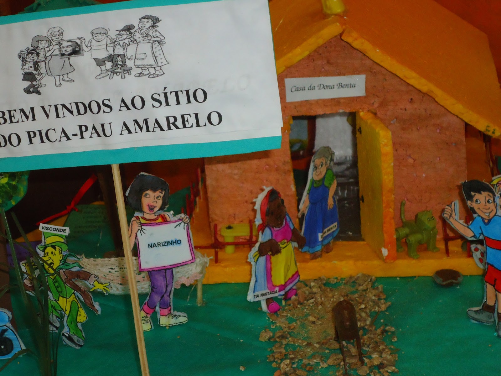 Maquete elaborada por alunos de 3º ano, homenageando Monteiro Lobato.Foram usados: placa de isopor, terra misturada com cola, palitos de sorvete, algodão, ál.