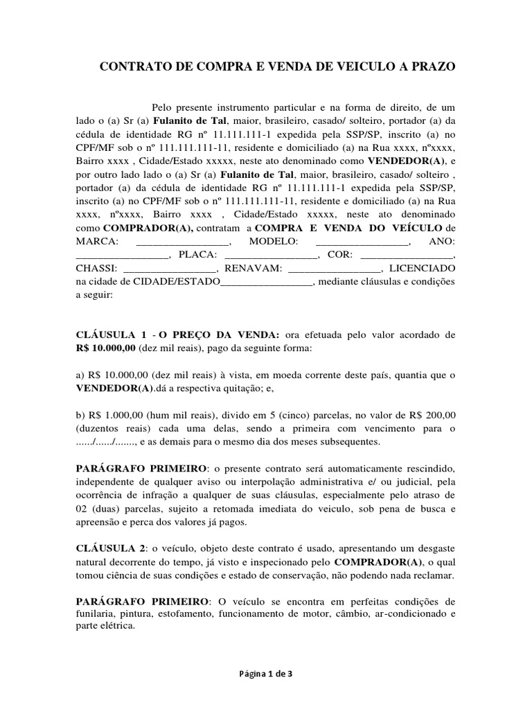 Modelo Contrato de Compra e Venda de Veiculo (Parcelado) Carro Negócios