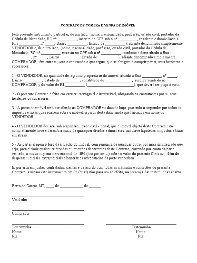 Modelo de contrato de compra e venda. A seguir, você encontra um modelo completo e gratuito de contrato de compra e venda. O modelo está adaptado à legislação brasileira e pode ser utilizado para a compra e venda de qualquer tipo de bem. CONTRATO DE COMPRA E VENDA DE IMÓVEL. Cláusula 1ª - Das Partes.