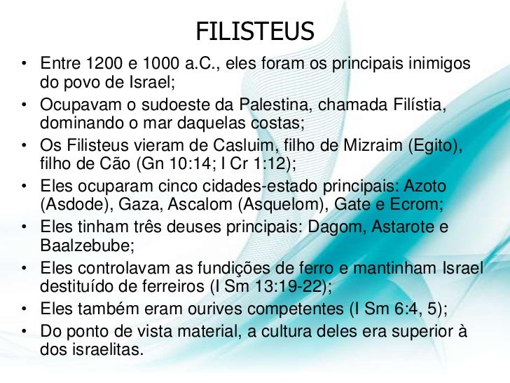 Quem são os descendentes dos filisteus? Na Bíblia, os filisteus são descritos como arqui-inimigos dos israelitas. Um povo estrangeiro, que veio do oeste e se estabeleceu em cinco cidades: Asdode, Ascalão, Ecrom, Gaza e Gate, hoje regiões do sul de Israel e Faixa de Gaza. Porque os filisteus eram inimigos de Deus?