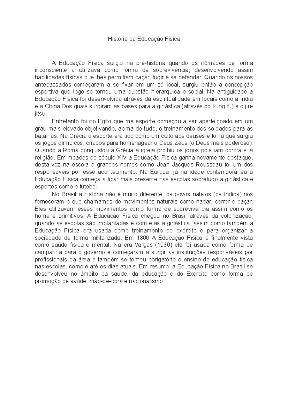 Resumo História da Educação Física: No Brasil e Períodos. O resumo da história da Educação Física abrange um grande mapa que nos leva a explorar o desenvolvimento humano através do movimento e da atividade física. O Escritora de Sucesso revela que, desde os primórdios da civilização, a necessidade de movimentar-se e desenvolver.