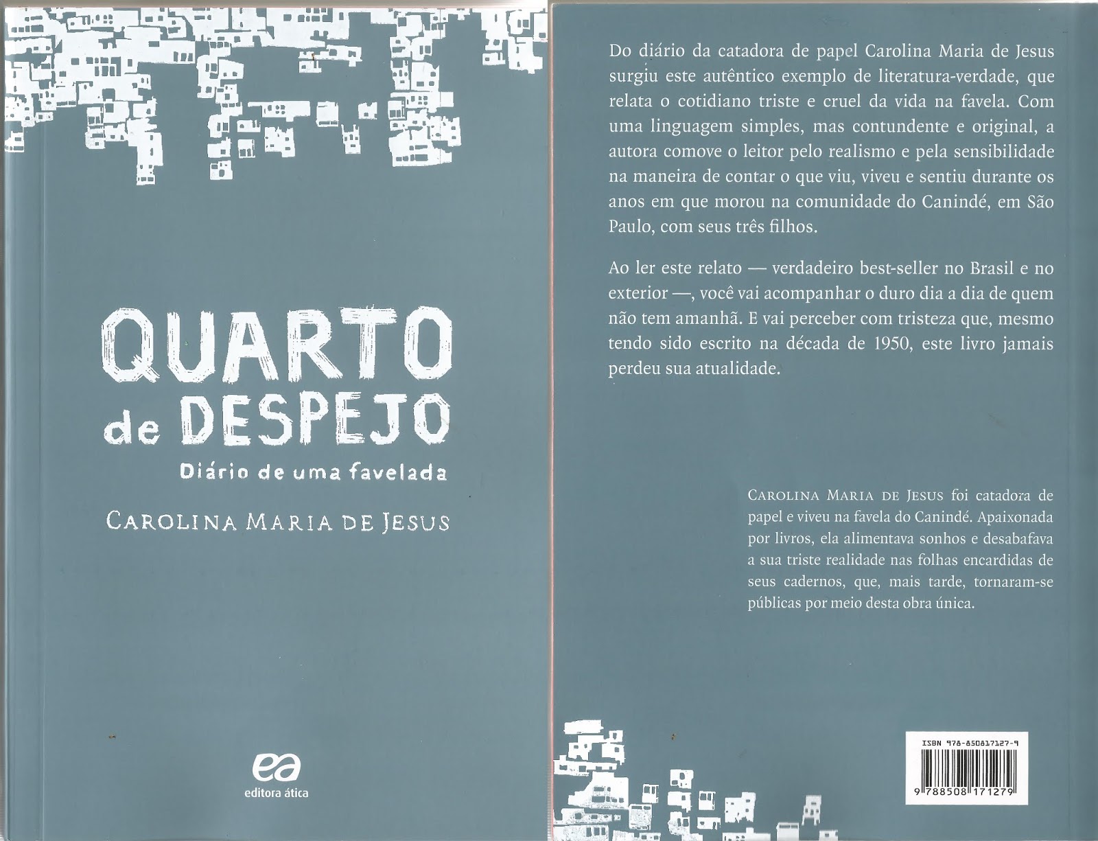 Título Original: Quarto de despejo: diário de uma favelada. Gênero do Livro: Memórias. Editora: Ática. Ano de Publicação: 2014. Número de Páginas: 200. Sinopse: O diário da catadora de papel Carolina Maria de Jesus deu origem a este livro, que relata o cotidiano triste e cruel da vida na favela.