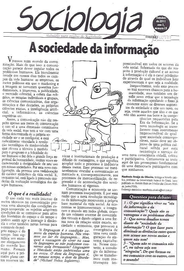 Abaixo reproduzo uma texto da Revista Mundo Jovem, assim como apresento uma proposta de atividade sobre o texto. Na frente da TV "Quando estou em casa, sozinha, sempre ligo a TV. Ela acaba com a minha solidão. É quase uma companhia. E eu tiro proveito disso. Quando minha família está em casa e a TV está ligada, nem precisa ter assunto.