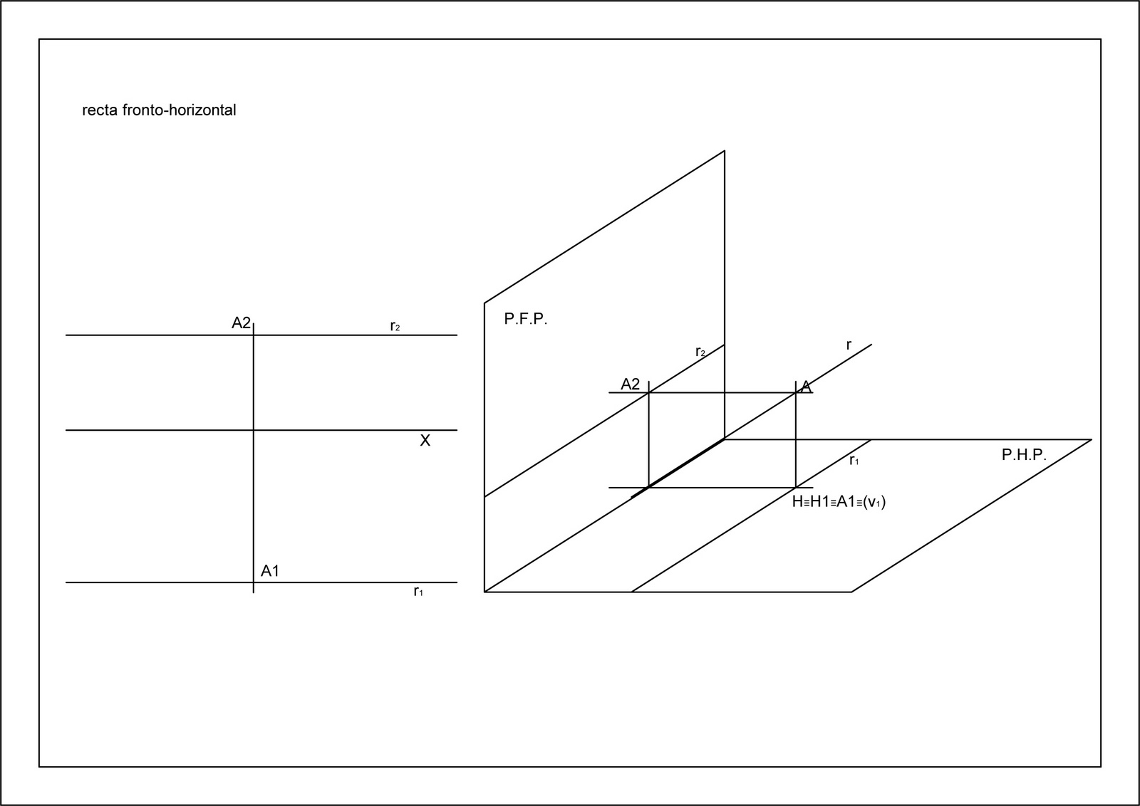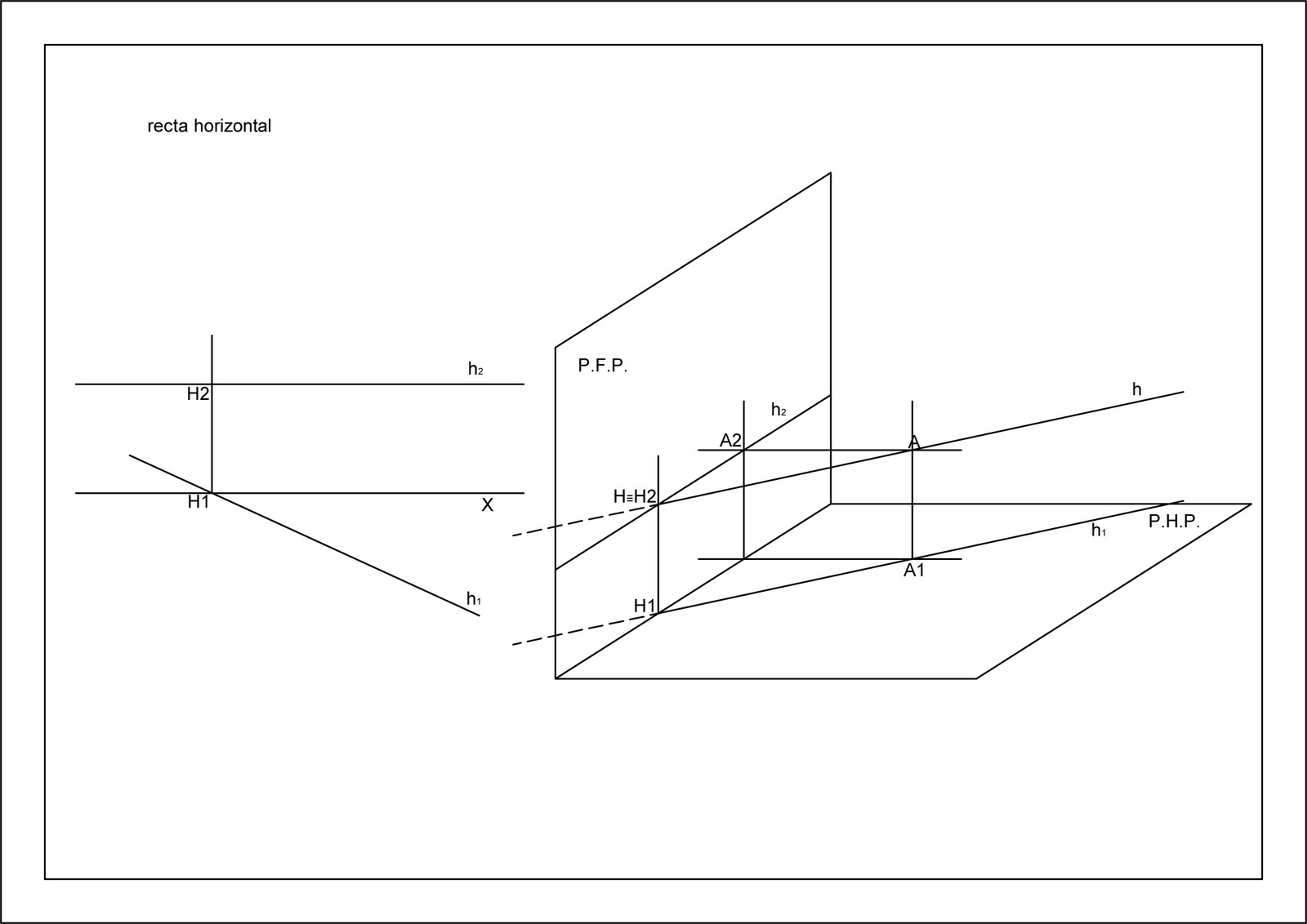Entes: pontos, retas, segmentos de reta ou semirretas. Na Épura. Adotou-se o rebatimento do P H sobre o P V em torno da L T, de modo que pontos no 1º Diedro tenham índice 1 abaixo da L T e índice 2 acima da L T. Reta Horizontal. Em Geometria Descritiva são dados nomes às retas, segundo a posição relativa de cada uma com o Referencial de.
